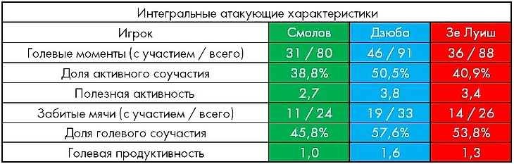 Как следствие, несмотря на некоторое «ударное превосходство», интегральные атакующие характеристики Смолова гораздо скромнее, чем у коллег по цеху.