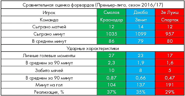 Чтобы ответить на эти вопросы проведем инженерно-аналитическую оценку основных характеристик центрфорвардов трех самых результативных команд текущего чемпионата, тем более что «Краснодар», «Зенит» и «Спартак» с точки зрения принципов ведения игры и базовой тактической схемы вполне можно назвать стилистическими аналогами.