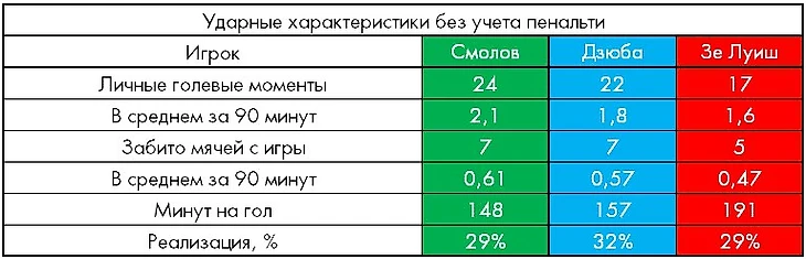 По основным ударным характеристикам (частота возникновения моментов, уровень реализации и, как следствие, результативность) Смолов опережает коллег по амплуа, но если в общей статистике не учитывать эпизоды с пенальти, о каком-то серьезном превосходстве над тем же Дзюбой говорить не приходится.