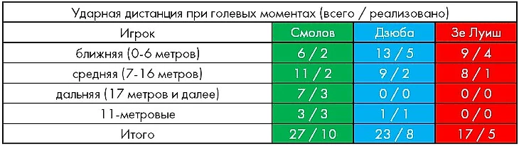 А вот если сгруппировать голевые моменты, которые возникали у форвардов, по ударной дистанции, то разница в их игровой манере становится очевидна невооруженным взглядом.