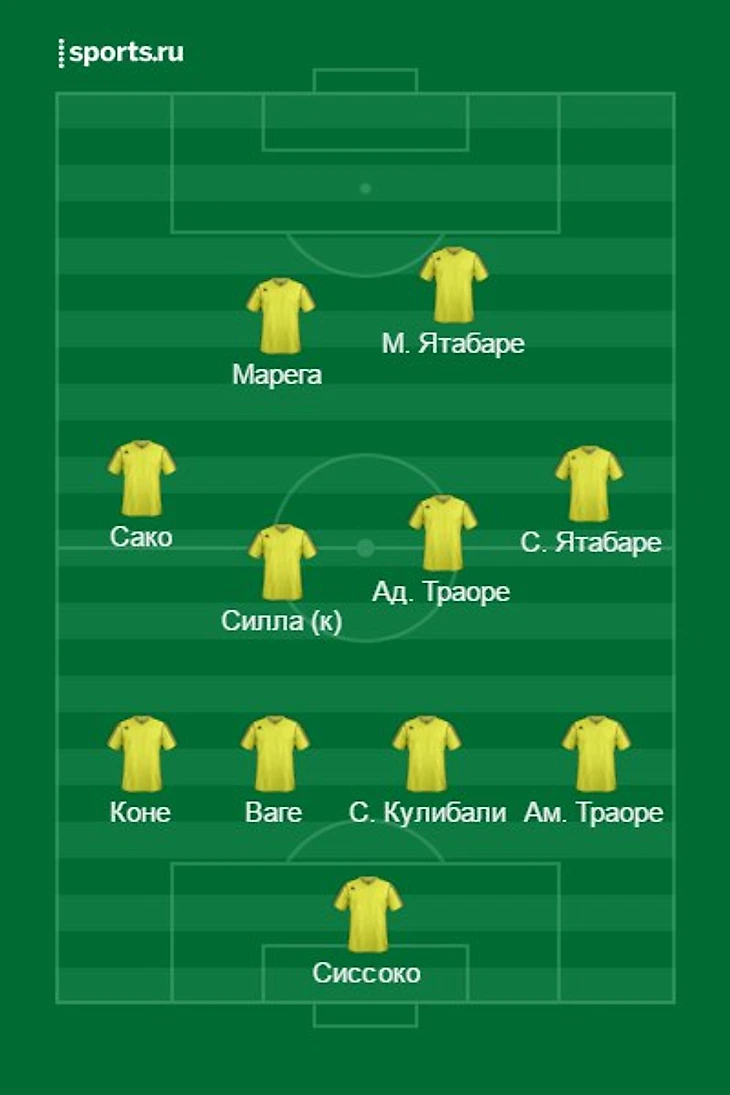 Сиссоко - Ам. Траоре, С. Кулибали (М. Н'Диайе), Ваге, Коне (У. Кулибали) - С. Ятабаре, Ад. Траоре (Л. Кулибали), Силла (к), Сако (М. Думбия) - Марега, М. Ятабаре (К. Кулибали)
