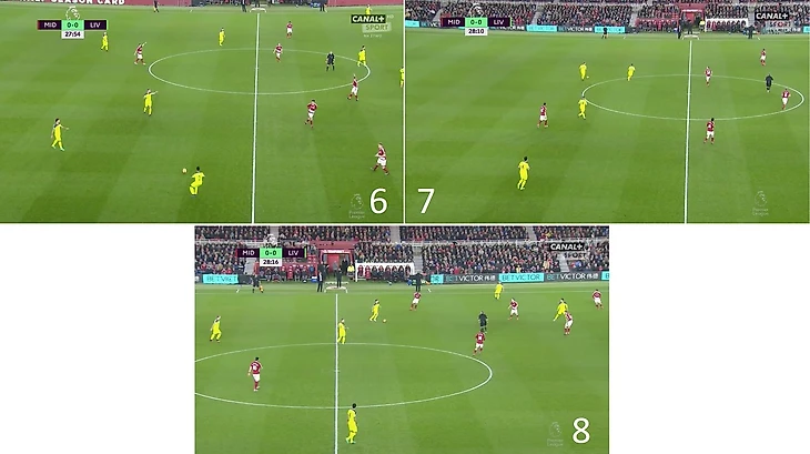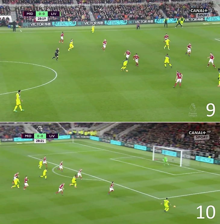В матче с «Мидлсбро» «Ливерпуль» «освободил зону» сделав 12 пасов. Следя за Адамом вживую можно легко запутаться. Длинные пасы на Мане, а потом на Клайна заставили соперника бежать назад (фото 6-7-8), и они не смогли предотвратить быструю доставку мяча на правого защитника (фото 9-10), чтобы тот не отправил его на голову Адзу. «Ливерпуль» снова перекатывает мяч справа налево, а затем быстро возвращает мяч на правую сторону Нэту. Как будто есть какая-то закономерность в их игре.