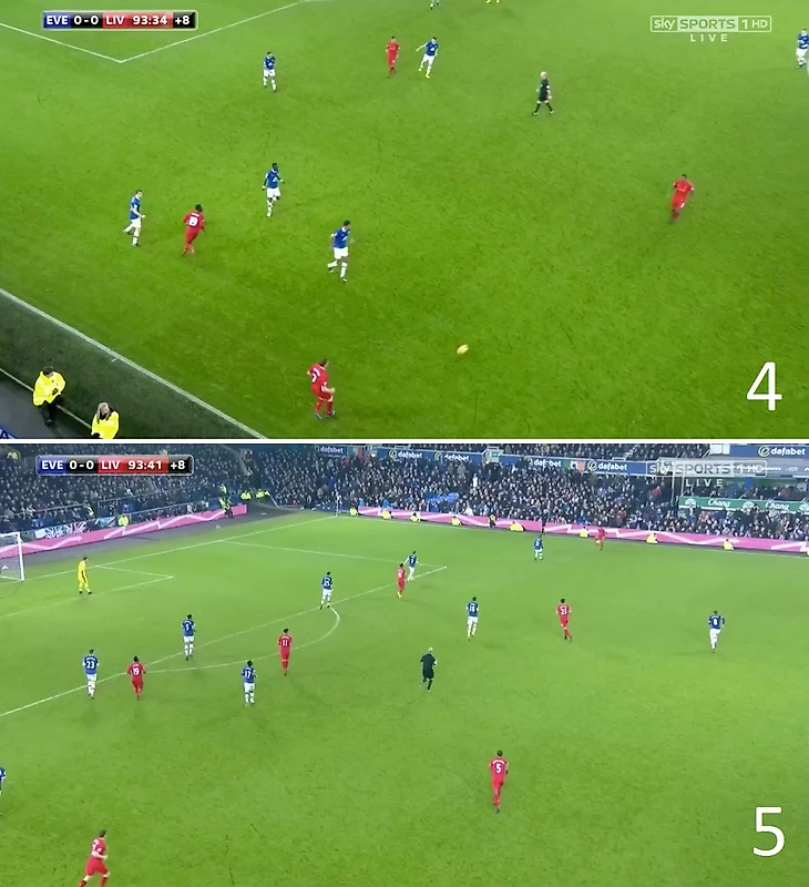 На фрагментах (фото 1-2-3) вы можете видеть различные свободные зоны на поле, из которых «Ливерпуль» переходил в голевую атаку. Они начали строить атаку ещё со своей половины поля и такой подход принес им дивиденды в конце. Они медленно перекатывали мяч с фланга Натаниеля Клайна на фланг Джеймса Милнера, мяч перешел Вейналдуму, который был открыт в центре и тот, дальним забросом, отправил его прямиком в глубину половины «Эвертона» на Клайна.