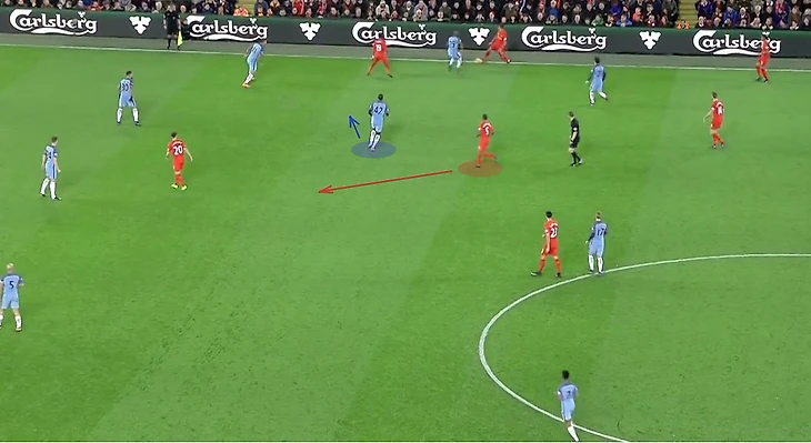 Ливерпуль защищается по схеме 4-1-4-1, но ситуационно Фирмино оказывается на позиции левого полузащитника, а Лаллана на месте форварда. Пока парни меняются, Давид Сильва обнаруживает очень привлекательную зону за их спинами, атака заканчивается опасным ударом.