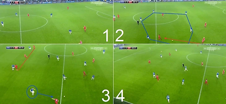«Ливерпуль» начинает атаку с выхода из обороны. Джордан Хендерсон опустился между двумя центральными защитниками. «Эвертон» надеется прессинговать. Росс Баркли освобождает свою позицию центрального полузащитника и бросается за Хендерсоном. Затем Эннер Валенсия покидает позицию правого полузащитника, для того, чтобы перекрыть путь Рагнару Клавану. Эстонец может легко отдать несложный пас, так как Баркли находится не там, где он должен быть.(Фото 1)