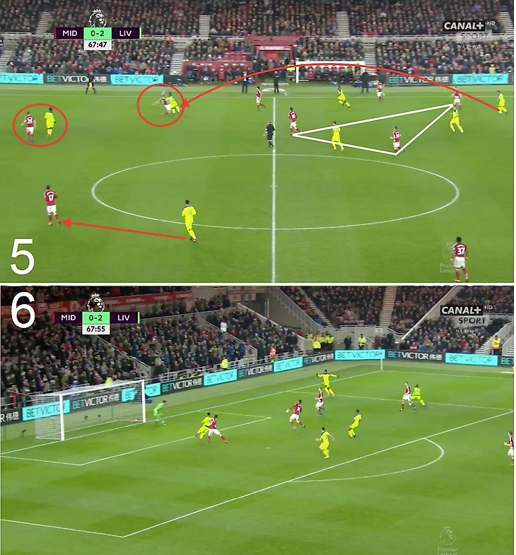 Центр полузащиты «Мидлсбро» связан треугольником. Они пытались прессинговать «Ливерпуль» и в процессе оставили Фирмино, Мане и Ориги, которые имели в свое распоряжение всю половину поля соперника, против Чемберса, Гибсона и Баррагана. Трио игроков «Боро» поднимаются выше в попытке вернуть себе мяч на половине поля «Ливерпуля». Однако пас верхом от Клайна оставляет всю полузащиту Мидлсбро вне игры и «Ливерпуль» переходит в атаку. Мане выигрывает беговую дуэль у Гибсона и легко уносится от него. (фото 5)