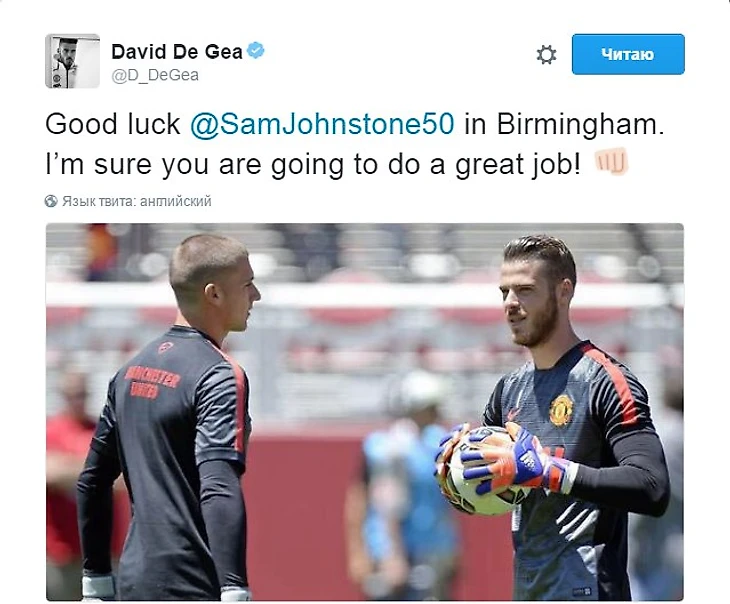 Давид Де Хеа не прошел мимо этого события и поздравил одноклубника и напарника по "раме" с переходом и пожелал удачи Сэму. Только вот, в своем сообщении о написал: "Good luck @SamJohnstone50 in Birmingham.", что переводится как: "Всего хорошего Сэм Джонстон в Бирмингеме."