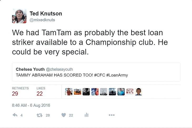 Еще в феврале моя группа в Брентфорде подготовила список молодых нападающих. Мы надеялись внести свой вклад в дела нашего клуба в этом сезоне и Том был на самом верху этого списка.* Он потрясающий талант, который показывает невероятную статистику, не будучи окружен качественными партнерами по команде в «Бристоль Сити». Таким образом, вы знаете, как я к нему отношусь. Вот мой твит с первого дня сезона в августе: