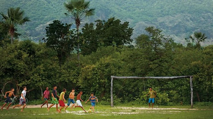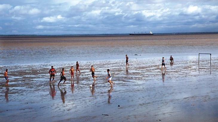 В футбол здесь играют и на фоне самых красивых пейзажей, таких, как эти покрытые лесами горы, и в самых неожиданных местах, например, на залитом водой берегу Амазонки или на крутом склоне фавелы.