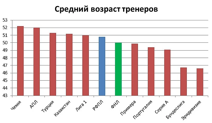 Самый старший средний возраст – у чешских тренеров (52,2 года). Средний возраст тренеров РФПЛ – 50,8 лет, ФНЛ – 50 лет ровно. Из ведущих чемпионатов самые молодые специалисты работают в Германии – 46,7. Самый опытный тренер РФПЛ – Мирча Луческу (71 год), самый молодой тренер Бундеслиги – Юлиан Нагельсманн («Хоффенхайм», 29 лет). Моложе всех в Европе – тренеры Северной Ирландии (40,6 лет).