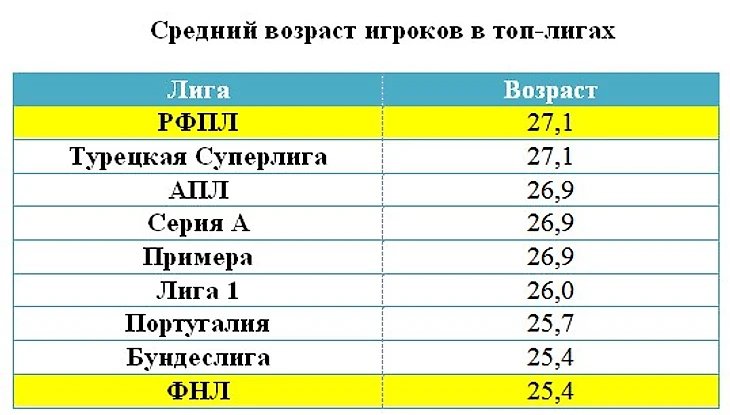 Самые «старые» лиги Европы по состоянию на январь 2016-го – РФПЛ и турецкая Суперлига. Более того, наш и турецкий чемпионат – единственные в Европе, в которых средний возраст игроков превышает 27 лет.