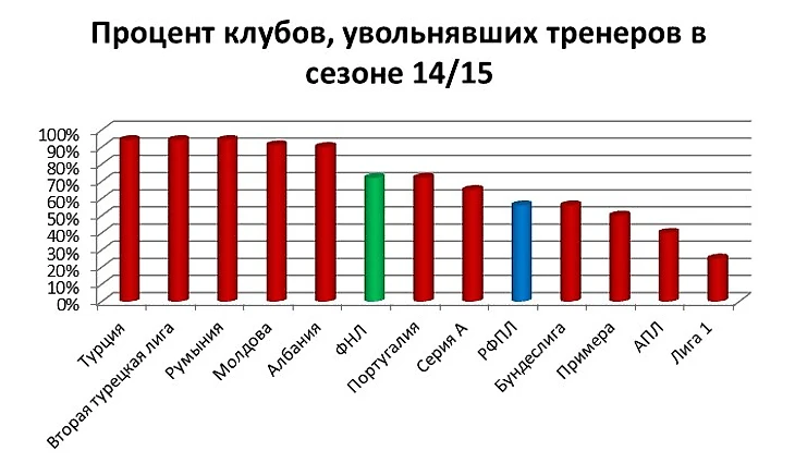 Руководители российских клубов в целом соответствуют современным тенденциям – РФПЛ и ФНЛ вместе с еще 26 лигами находятся в средней зоне (в ней процент тренеров, потерявших работу по ходу сезона 14/15, составил от 50% до 74%). Самые нетерпеливые менеджеры работают в Восточной Европе.
