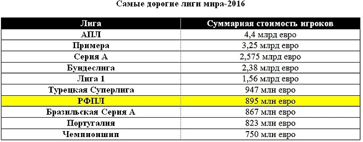 В своем отчете УЕФА указывает трансферную стоимость за весь 2016 год, поэтому у РФПЛ учитывается стоимость Халка, Гарая, Витцеля и Мусы. Во многом благодаря игрокам, уже покинувшим наш чемпионат, РФПЛ расположилась на 7-м месте в рейтинге самых дорогих лиг мира. Лидер очевиден чуть более чем на 100%.