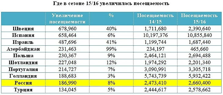 Как ни странно, посещаемость чемпионата России выросла за последний год. Если в сезоне 14/15 матчи РФПЛ посетило 2,473,410 человек, то в сезоне 15/16 – 2,660,400 человек. Посещаемость выросла на 186,990 человек или на 8%. Это нормальный показатель для не топ-лиг (поражает прирост зрителей в Швеции).