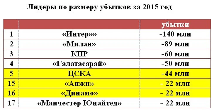 Лишь у двух представителей топ-20 по убыткам («Манчестер Юнайтед» и «Челси») финансовые потери не превышают 10% общего дохода. Убытки ЦСКА, «Динамо» и «Анжи» превышают 20% доходов клубов.