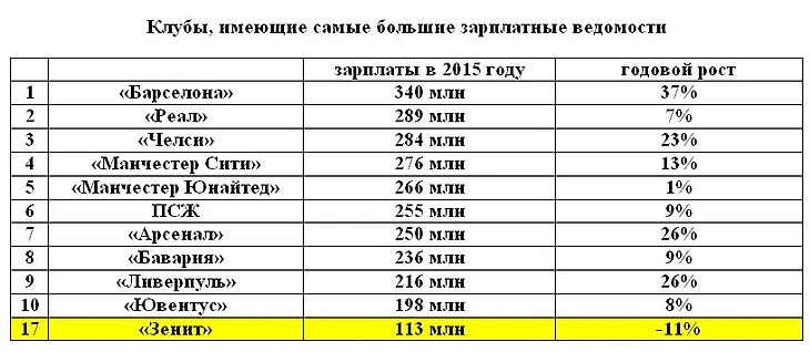 Зарплатная ведомость всех работников «Зенита» уменьшилась на 11% по сравнению с 2014 годом. Кроме питерского клуба зарплаты сократились в «Шальке» (-3%) и в «Интере» (-1%).