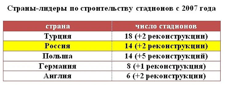 Россия наряду с Польшей и Турцией – лидер по строительству стадионов в последние годы. Если нам еще предстоит принимать чемпионат мира и Кубок Конфедераций, а в Польше четыре с половиной года назад прошло Евро, то в Турции строительство новых сооружений не связано с проведением какого-либо крупного соревнования.