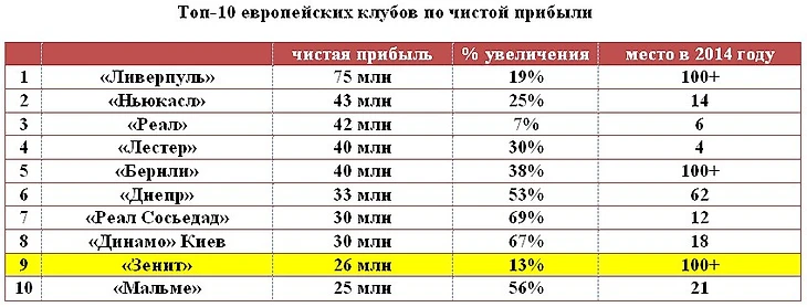 «Зенит» совершил очень серьезный скачок из второй сотни. Не последнюю роль сыграла сдержанная трансферная политика петербуржцев и продажа Рондона в «Вест Бромвич» за 18 млн евро. Первое место «Ливерпуля» также объясняется трансферными делами – УЕФА сообщает о выгодной продаже звезды клуба. Видимо, речь идет о трансфере Луиса Суареса в «Барселону». Согласно данным Football Leaks, в 2015 году каталонцы отправили в Англию два транша в размере 13 млн фунтов каждый.