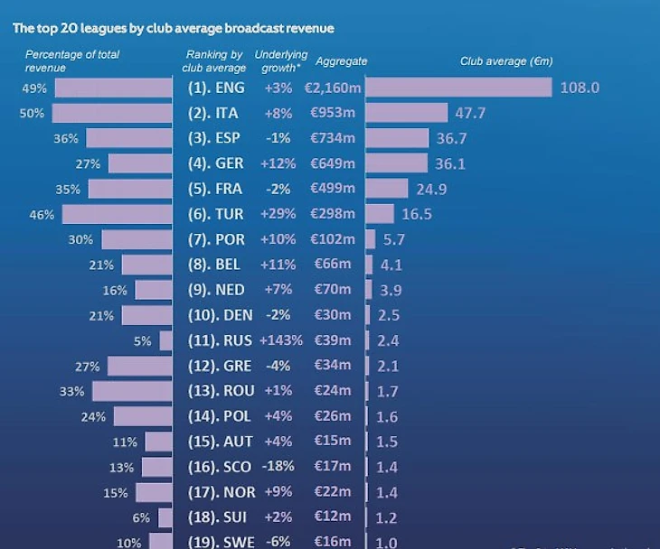 Логично, что доходы от трансляций составляет крайне малую часть доходов клубов, в первой двадцатке меньше российских 5% нет ни у кого.