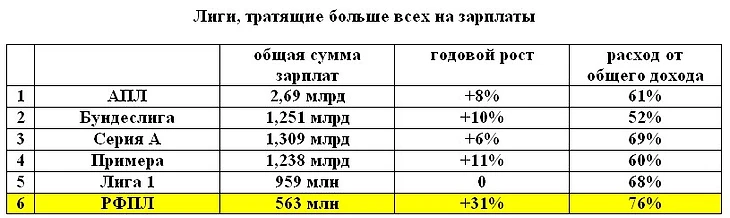 По общей сумме, уходящей на зарплаты, РФПЛ занимает 6-е место в Европе.