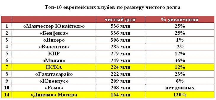В списке должников фигурируют два российских клуба – ЦСКА и «Динамо».