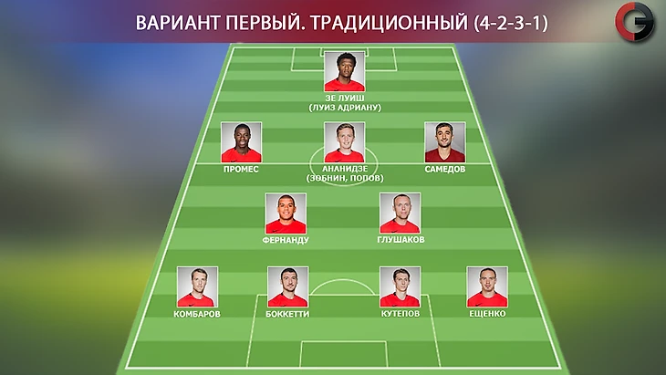 Альтернативным подтипом расстановки с тремя центральными защитниками может стать и смещение Самедова в центр. Ещенко займет место справа, Комбаров – слева, необходимый объем в опорной зоне обеспечат работоспособные Фернандо и Глушаков (или Зобнин), предоставив Александру чуть больше свободы в атакующих действиях.