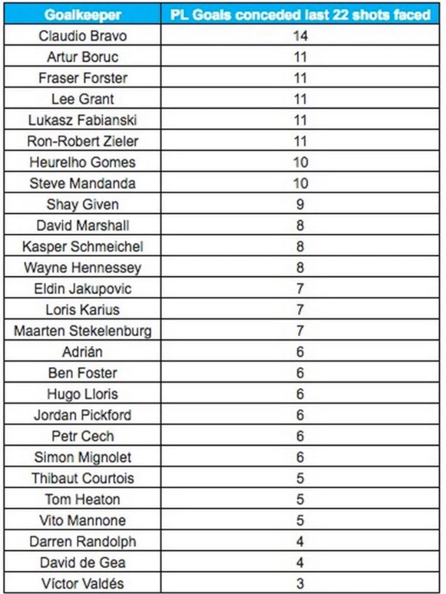 А вот другой бывший вратарь Барселоны над которым в свое время очень сильно смеялись и вообще за футболиста то не считали (и я в том числе) за те же 22 удара пропустил всего 3 и находится на противоположном полюсе таблицы, опережая, даже страшно подумать, самого Давида Де Хе!