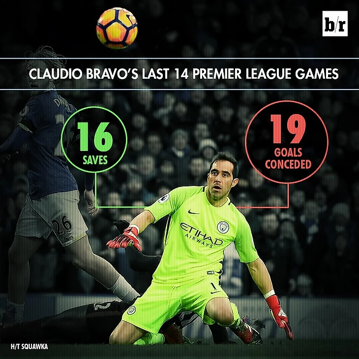 В 14 последних матчах Премьер Лиги Клаудио Браво совершил 16 сейвов, но пропустил целых 19 голов!!!! Больше половины ударов!!! Бог мой!!!