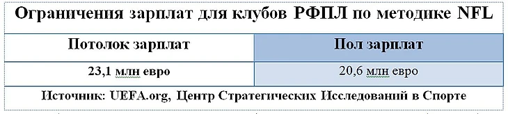 По сравнению с результатом прошлого года потолок бы упал на 290 тысяч евро на команду, что с учетом сегодняшних реалий профессионального футбола сравнимо с каплей в море. Однако позитивная динамика могла быть дать повод для оптимизма. Североамериканские лиги также устанавливают и «пол» зарплат, то есть минимальное значение совокупной зарплатной ведомости команд. Делается это как раз затем, чтобы регулировать разброс в зарплатах , тем самым уравнивая финансовую составляющую и, следовательно, соревновательную. В NFL пол зарплат составляет 89% от потолка.