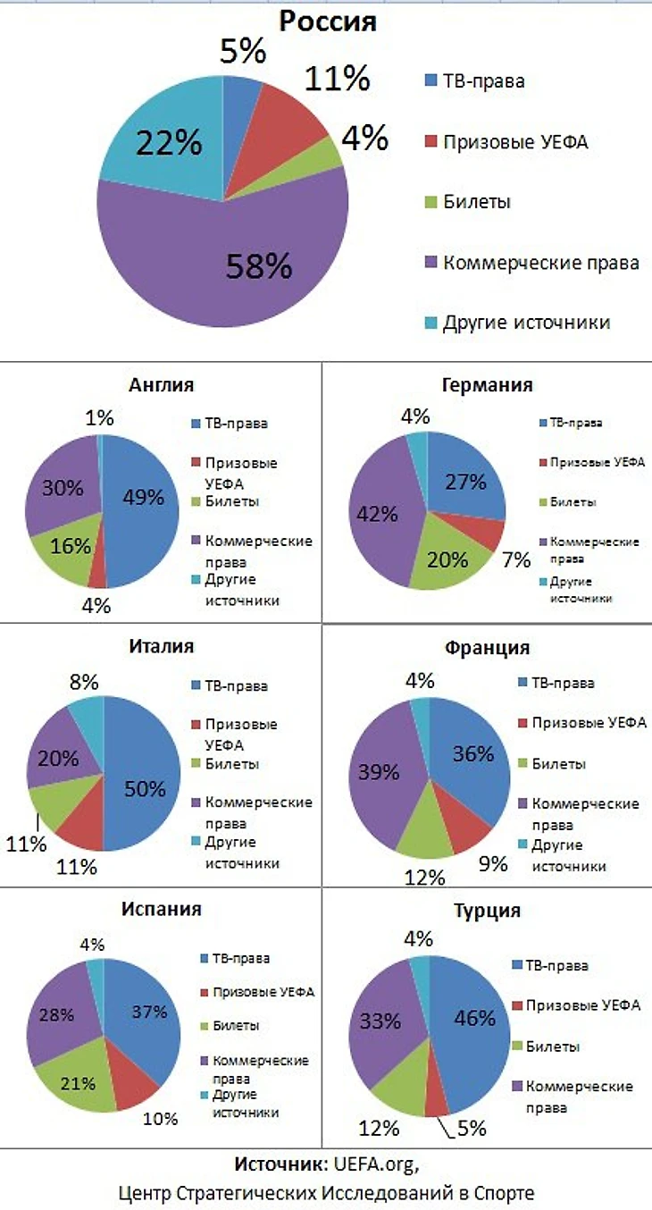 По сравнению с ведущими европейскими лигами (помимо клубов РФПЛ более 500 млн евро смогли заработать представители высших дивизионов Англии, Германии, Франции, Испании, Италии и Турции). Чтобы лишний раз не расстраиваться, сравнивать объемы выручки здесь не будем. Однако сопоставление удельного веса каждого источника в совокупной выручке выглядит вполне целесообразно.
