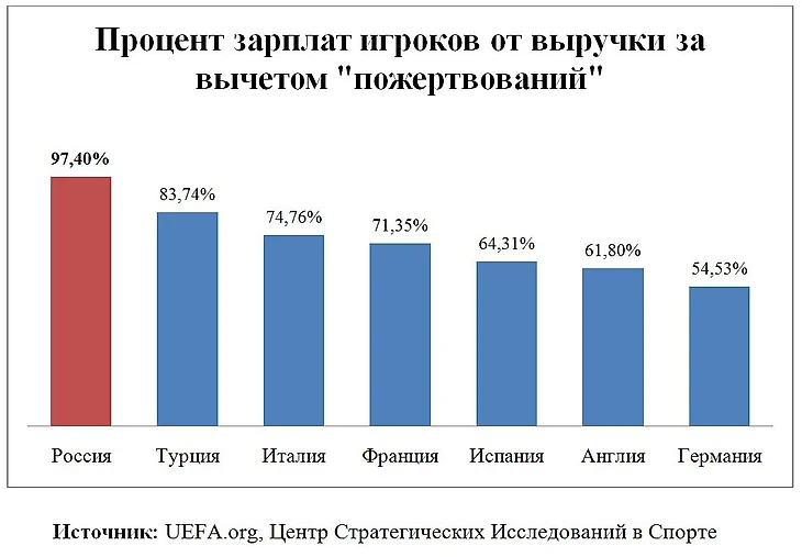 В низших лигах Англии нельзя использовать более 60% совокупного дохода (то есть выручка + доходы от трансферов + внеоперационные доходы) клубов на зарплаты спортсменов. На 15% единовременно сократить зарплатные ведомости клубов видится излишне утопическим событием для российского футбола. Однако следует учесть, что российские клубы в разы больше злоупотребляют «пожертвованиями» в виде безвозмездных выплат акционеров и государственных субсидий. Без этой статьи дохода клубы РФПЛ отдают 97% выручки на содержание спортсменов. При этом, как показывает рисунок ниже, для остальных стран ситуация не сильно изменилась при вычете «других источников» выручки. При таком раскладе желательно хотя бы близко подойти к показателю топ-5 чемпионатов и приравнять предельное соотношение зарплат выручки к 75%.