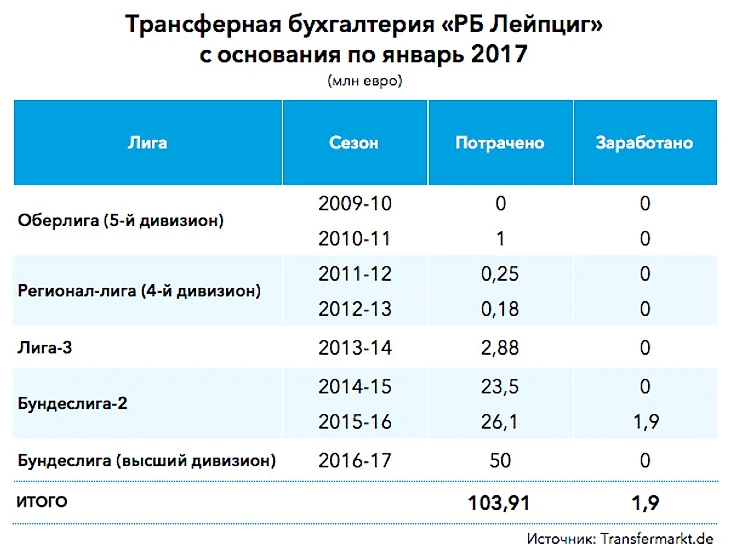 В «Ред Булле» на претензии иногородних болельщиков внимания не обращают (а, возможно, и вовсе радуются – лишнее бесплатное внимание к компании) и продолжают бережно строить в Лейпциге чемпионский клуб. В 2009-м, когда проект только начинался, СМИ неофициально называли трансферный бюджет в 100 млн евро на 10 лет. К восьмому году существования эта цифра превышена, но совсем немного. Причем почти половина этой суммы (50 млн евро) была истрачена летом-2016, перед стартом в Бундеслиге, а весомая ее часть (21 млн евро) ушла на покупку игроков «Ред Булл Зальцбург».