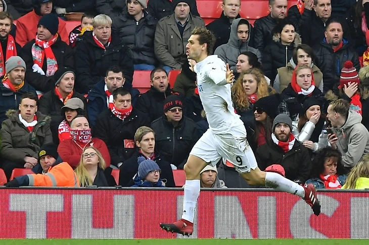 А вот второй тайм начался с гола гостей после углового .Сигурдсон подал на дальнюю , мяч от Фернандеса и Ольсона отскочил к Льоренте , который вонзил мяч в сетку с близкого расстояния, 0-1.Буквально через пару минут новички лебедей разыграли шикарную комбинацию на левом фланге,Кэрролл навесил в центр штрафной , где высоченный баск перевесел всю оборону Ливерпуля и головой оформил дубль ,0-2.