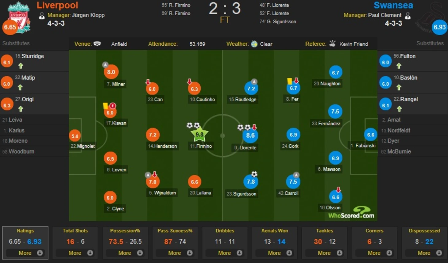 Помня прошлогодние камбеки Ливерпуля против Бруссиии(4-3) и Норвича(4-5) , было чувство , что хозяева смогут хотя бы сравнять счет . И у хозяев было как минимум 3 момента для этого .Сначала Ориги с близкого расстояния попал в Фабиански , а затем поляк отбил дальний удар Ловрена . В конце матча ,после неразберихи, в штрафной лебедей мяч от Лалланы отскочил в перекладину и даже после добивания мяч пролетел выше ворот . Суонси выстоял и заработал заслуженные 3 очка . Большое влияние привнесли новички команды Пола Клемента , особенно Том Кэрролл . Это был его возможно лучший матч в карьере. Посмотрим , смогут ли лебеди остаться в элите английского чемпионата . Пока работу английского тренера оценивать трудно , но некоторые улучшение в игре присутсвуют . Это касается обороны . Лебеди стали доволи неплхо защищаться , несмотря на 2 пропущеных гола от Ливерпуля.