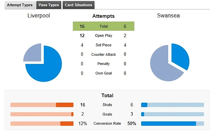 Статистика полностью в пользу Ливерпуля , но это не удивительно , ведь в этом сезоне на Энфилде гостям приходится крайне трудно .В 10 домашних поединках хозяева забили 28 и пропустили 10 голов. Впечатляет. Самое интересное происходило во втором тайме , мы увидели настоящую драму. В первом тайме можно вспомнить разве ,что удар Лаланы через себя и прострел Кэрролла в штангу.