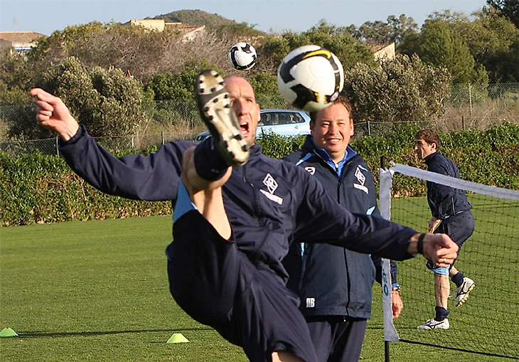 Вопрос стоял один: игроку 36 лет. «Боялся, – продолжает Слуцкий. – что в силу возраста или еще каких-то причин ему понадобится особое благоприятствование. Но – нет. Работает он великолепно, отдается на сто процентов так же, как в игре». Выиграть верховую дуэль у человека, носящего бутсы 50 размера – дело великой чести. Потому конфликтовали. «Помню, с Ваней Тарановым несколько раз сшиблись. Но Ян умеет как-то снисходительно по-доброму ко всему этому относиться, что даже намека на конфликт не возникает». Зато бутсы впечатлили всех. Шьются они только на заказ, так что внезапная пропажа чемодана перед игрой равнялась краху: такую обувь в России не сыщешь.
