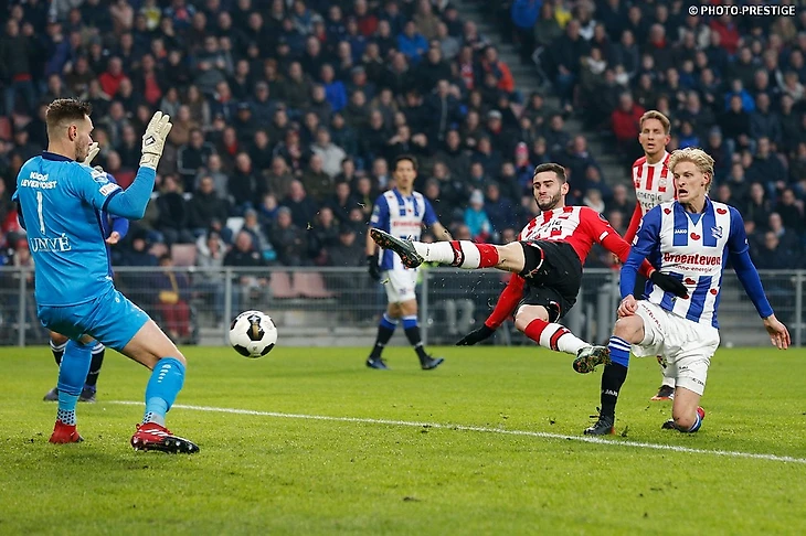 Встреча началась для хозяев с холодного душа: разыгравшийся Гочанежад забил свой очередной мяч. На 5-й минуте Ларссон искусным пасом вывел иранца один на один с Зутом и тот не сплоховал. 0-1! Ошеломляющий дебют! Но «лампочки» с ван Гинкелем и здоровым Гуардадо – это не та пародия на ПСВ, что была в первом круге. Движение, движение и ещё раз движение – то, чего так не хватало Эйндховену в этом сезоне, наконец, появилось и защитники «Херенвена» с трудом поспевали за атакующими перемещениями хозяев. На 7-й минуте Шмидт вынес мяч с ленточки. На 27-й Шваб пробил в каркас ворот. Ну а на 31-й счёт стал равным: Проппер после длинного паса Морено переиграл допустившего ошибку на выходе Мюлдера и отправил мяч в сетку. Спустя ещё 8 минут ПСВ уже лидировал: де Йонг головой сбросил мяч на дальнюю, где поджидал Перейро. 2:1.