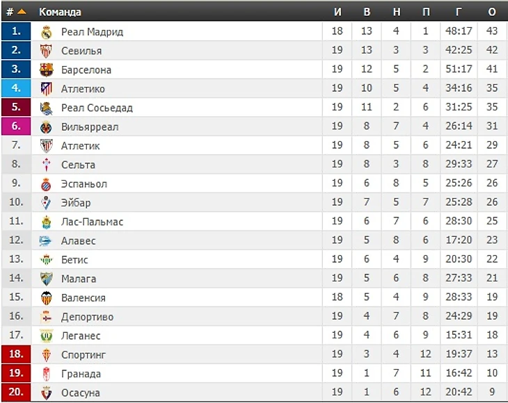 Леганес умеет удивлять (победа над Сельтой, ничья с Атлетико), но пока вряд ли может рассчитывать на нечто большее, чем борьба за выживание. Хотя старт неплох — 18 очков и 5 пунктов до обратной высылки.