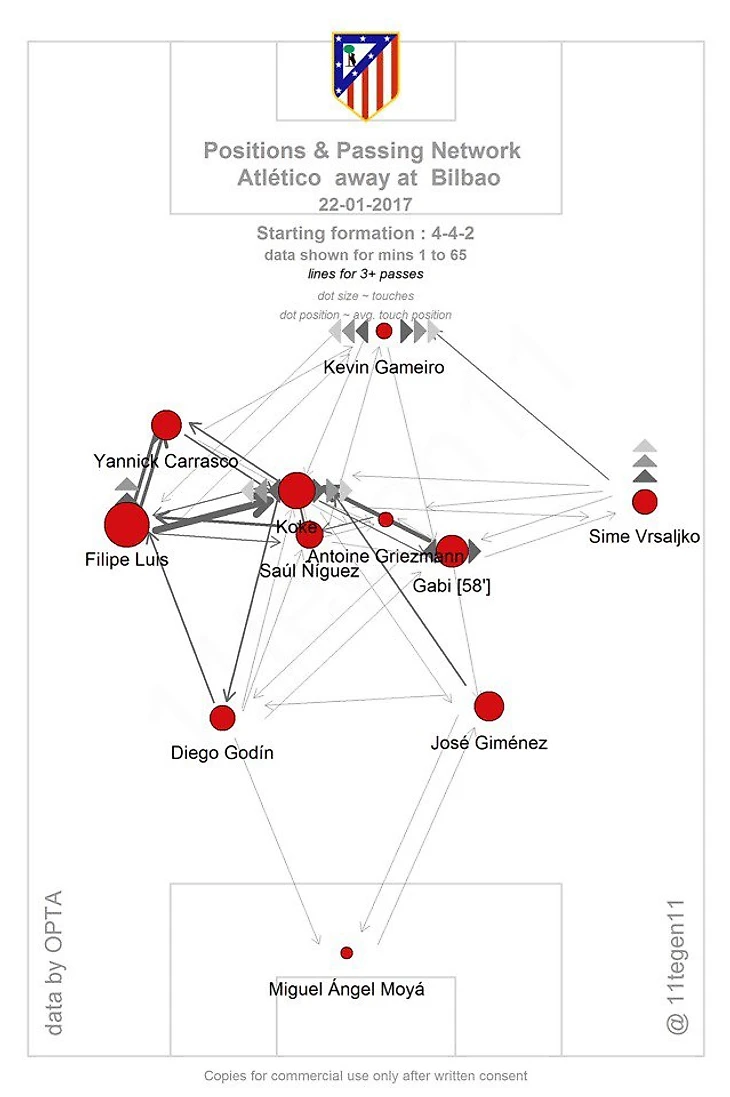 После перерыва Диего было вернул схему с тремя нападающими, но сценарий матча заставил вновь вносить коррективы и Чоло сразу же пошёл ва-банк, сняв одного из центральных полузащитников и добавив форварда. Торрес активно вошёл в игру и дал команде ещё один вариант построения атак-с помощью лонгболлов. Далее выход Корреа и Гайтана до предела насытил атакующую линию и при поддержке пары Сауль-Коке это стало выливаться в довольно мощное давление. Правда оборона басков очень достойно держалась и порой пыталась направить своих атакующих игроков в контратаки. Однако беда в итоге пришла откуда не ждали-из опорной зоны.