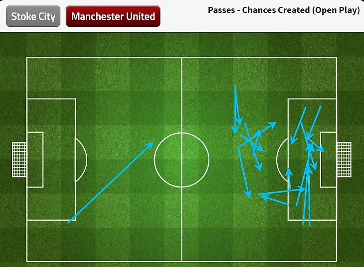 «Сток» не справился с перегрузом центра от «МЮ». Изначально хозяева начали в 4-2-3-1, им не всегда удавалось соблюдать компактность в обороне – образовывалось пространство между линиями защиты и полузащиты, которым неплохо пользовался «МЮ», в следствии чего создавались моменты. Стандартный для этого сезона маневр «Юнайтед» – перегрузка центральной зоны – работал эффективно: Мата и Мхитарян играли достаточно узко, вглубь отходил Златан, в зону десятки приходил Погба. «Манчестер» стабильно имел численный перевес в зоне перед штрафной. Карта передач в финальной трети поля (вообще сложно что-то понять по этому месиву, но кучность стрелок в целом позволяет оценить общую картину) дает понять, что в центре «МЮ» провел приличное число времени и создавал оттуда моменты (38% атак через центр – больше чем через каждый из флангов – это вообще достаточно редкая ситуация, если принимать в расчет специфику подсчета этого типа статистики).