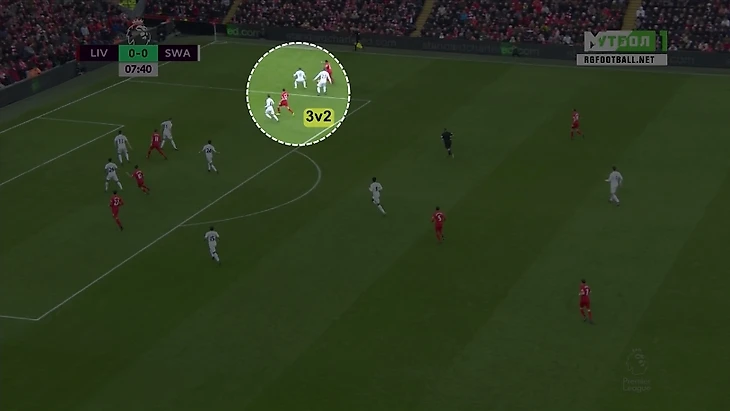 Выход «Суонси» в контратаку. «Лебеди» сделали явный упор на контратакующую игру (что вполне понятно при всего 26% владения мячом), но регулярно сталкивались с немалыми трудностями при выполнении этой тактики. Причина – в активном контрпрессинге «Ливерпуля», в результате которого большинство попыток «Суонси» выйти в контратаку пресекались ещё в зародыше. В определённой мере поспособствовали контрпрессингу соперника и сами игроки «Суонси»: сказалась неустойчивость некоторых игроков к прессингу, что приводило к массовым потерям мяча. Больше других в этом плане «отличились» Льоренте и Раутледж, которые на двоих насобирали целых 17 потерь (почти все из них на правом фланге – отсюда и столь впечатляющая карта отборов «Ливерпуля»).