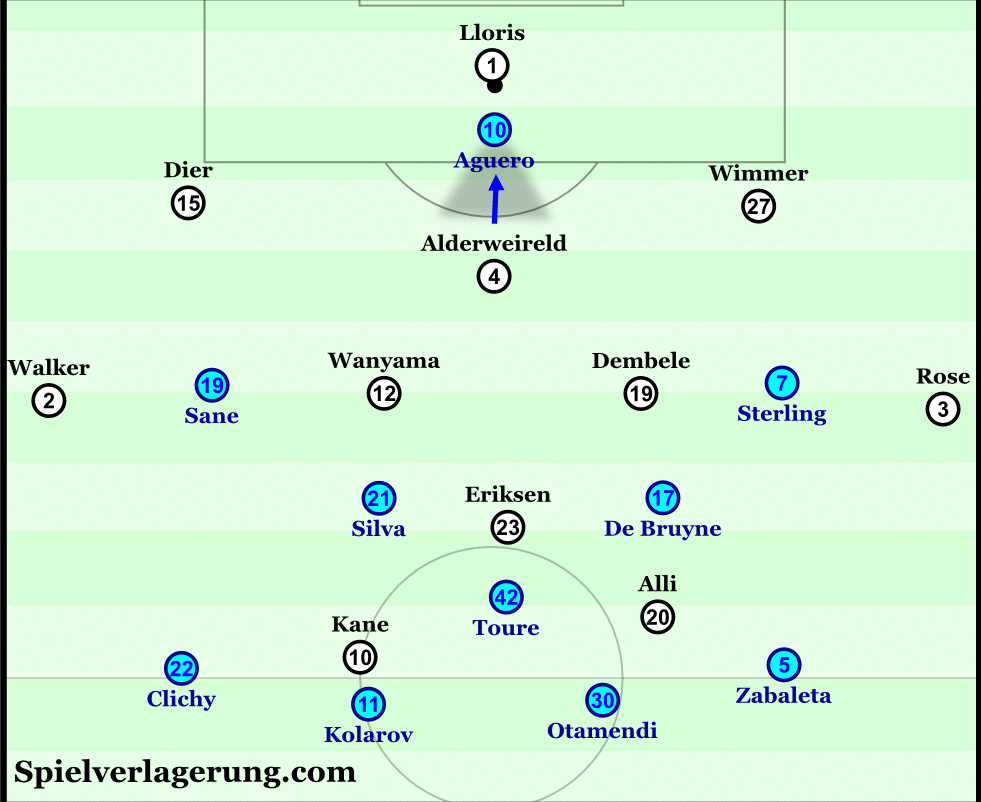 «Тоттенхэм» не справился с прессингом «Сити». Перед матчем Пеп Гвардиола назвал «шпор» «лучшей командой лиги, если ты даешь им играть». Соответственно, главная задача для Пепа формулировалось легко: не дать играть «Тоттенхэму». Для этого Гвардиола обратился к схеме 4-1-4-1, с которой выдал многоматчевую серию из побед на старте сезона. Эта расстановка позволила приставить к каждому защитнику «шпор» по атакующему игроку «Сити» (Сане против Дайера, Агуэро против Тоби, Стерлинг против Виммера), что в свою очередь затрудняло для гостей выход в атаку. Особенно интересную роль выполнял Агуэро: в его обязанности входила не только опека Альдервейрельда, но и прессинг Уго Льориса.