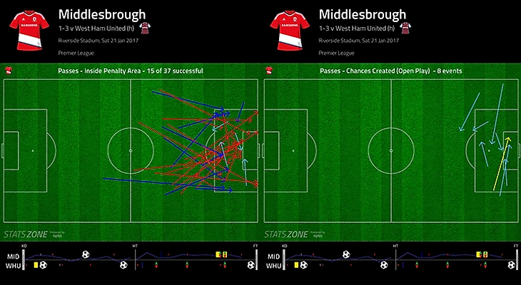 «Мидлсбро» не хватает созидателя. Недавно мы иллюстрировали проблему «Мидлсбро» в матчах, где они вынуждены владеть мячом через цифры остроты моментов. С 61% владения против «Вест Хэма» трудности проявились, даже еще более показательно.