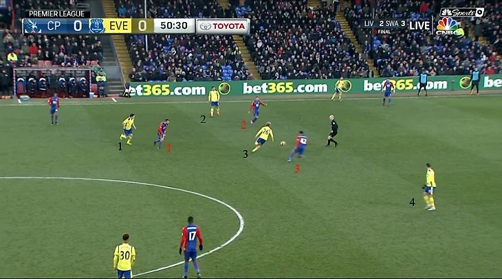 «Пэлас» не справился с численным преимуществом «Эвертона» в центре. Второй матч подряд «Эвертон» проводит в схеме с 3 ЦЗ, одним нападающим и ромбом в полузащите (грубо говоря, 3-5-1-1) – достаточно гибкой расстановке, которая позволяет и вдвоем перекрывать направления для передач в центр (Миральяс помогает Лукаку), и прессинговать 3 в 3 (Баркли или Дэвис, чаще первый, поднимаются наверх, что, впрочем, не является отличительной особенностью этой расстановки – такой маневр с подстроением схемы под прессинг является стандартным), и защищаться Миральясу при позиционной обороне глубоко, помогая своим полузащитникам. В атаке движение бельгийца вглубь так же было чрезвычайно важно: он помогал создавать численный перевес 4v3 в полузащите.