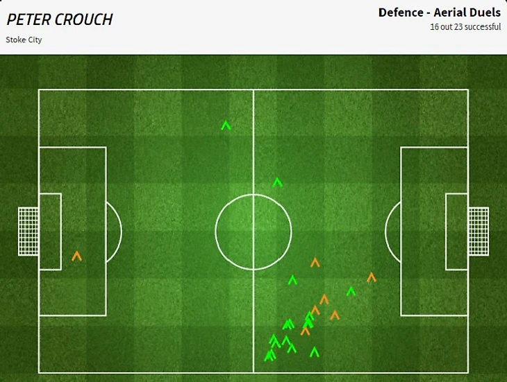 С «МЮ» Хьюз обратился к схожему плану – Крауч намеренно смещался на левый фланг обороны «МЮ» и выиграл 16 из 22 верховых мячей в атаке. Логика рывков именно в эти зоны ясна – против Блинда, Джонса и Погба (все трое закончили матч с отрицательной динамикой верховых единоборств) гораздо проще вести борьбу, чем с Феллайни, Смоллингом и Валенсией (любопытно, что «Сток» забил после чуть ли не единственного случая борьбы Крауча со Смоллингом в отдаленной зоне). Говорящая цепочка фактов: 39 передач – больше всех в «Стоке» – сделал вратарь Ли Грант, 35 из них были лонгболлами; вдобавок, самым популярным вектором передач в матче было направление Грант – Крауч (21 попытка), а следующие 17(!) пар составили уже игроки «МЮ».