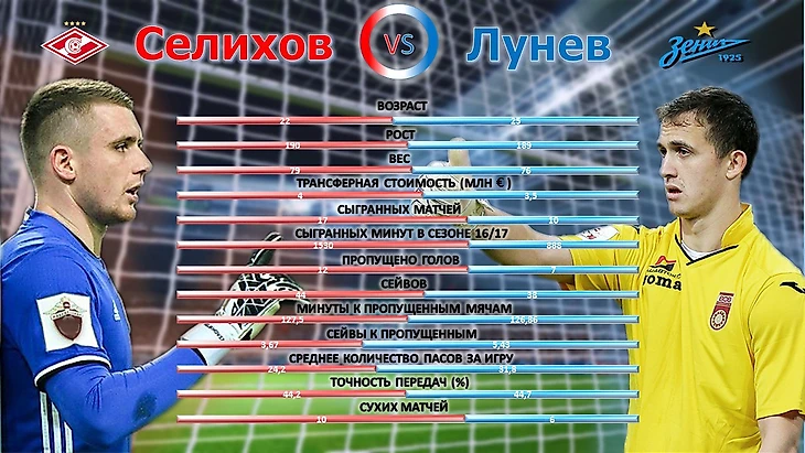 Очевидным преимуществом Селихова является опыт в матчах РФПЛ. Новобранец «Спартака» принимал участие в 17 встречах против 10 Лунева этого сезона, и в 23-х предыдущего. Новый вратарь Зенита в сезоне 15/16 играл за молодежную команду «Уфы».  “Сухих” матчей в этом сезоне Лунев провел 6 из 10, Селихов - 10 из 17. Частное почти одинаковое, но цифры спартаковца выигрышней.