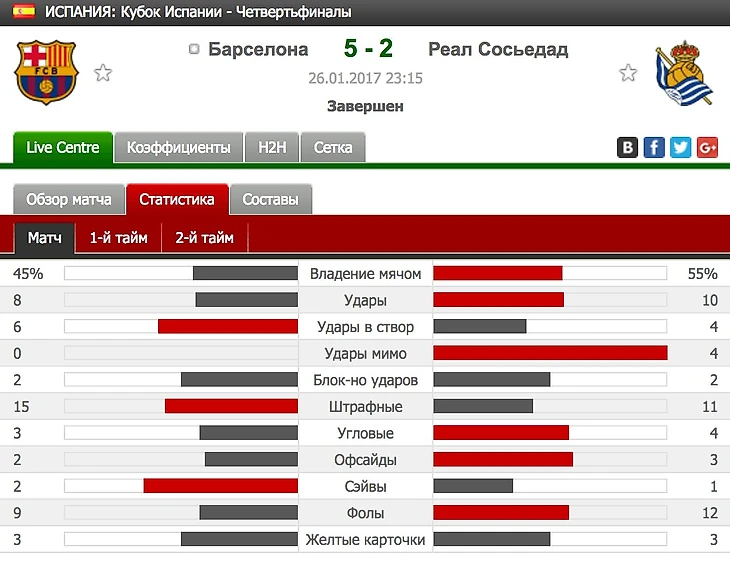 Сосьедад играл в смелый футбол и сумел сделать невероятное – владеть мячом больше времени, чем Барселона. Но, как часто любят говорить в сторону самого Каталонского клуба: «Вы мячом владели, а толку?» Только в более грубой форме. Что касается ударов, то у Барселоны они были намного опаснее и, как мы можем заметить по счету, эффективнее.