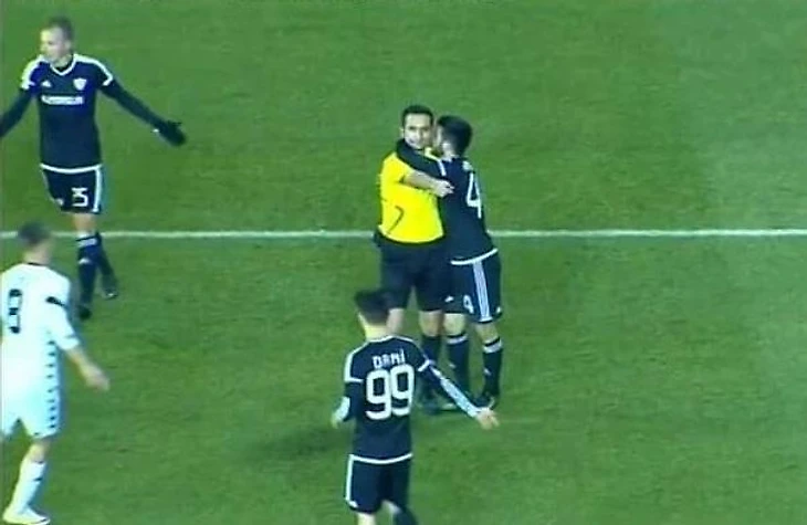 Футболист Карабаха обнимает арбитра в знак благодарности за назначенный сомнительный пенальти