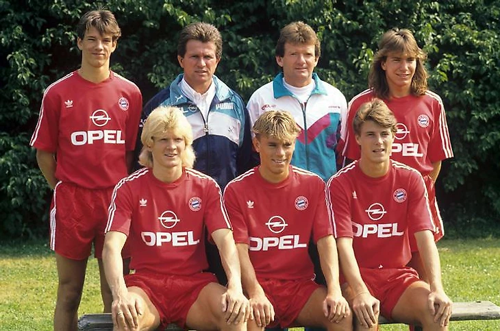 1990 год. Новички "Баварии" Кристиан Циге, Михаэль Штернкопф, Штефан Эффенберг, Алан Нильсен и Бриан Лаудруп с Юппом Хайнкесом и его помощником Эгоном Кордесом