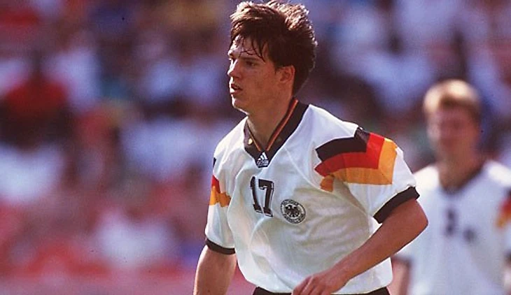 Ну а летом того же года сборная Германии в третий раз выиграла Чемпионат Европы по футболу, проходивший на полях Англии. На фото - наш герой в матче группового турнира Евро-96 против сборной Италии противостоит своему будущему одноклубнику Паоло Мальдини. Матч завершился со счетом 0-0